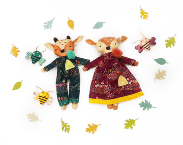 Every doll deserves clothes and seeing as it is Autumn here, I thought it best to dress these Deer Dolls for the weather. The long-sleeved Doll Jumper pattern is perfect to showcase these gorgeous prints and keep the Deer Dolls warm. I added a 3" half-folded hem to trim the dress and pants. I love how the accent fabrics play together in this line.
