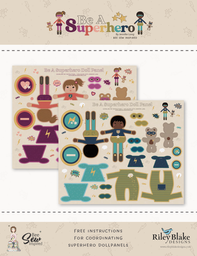 Use the Be A Superhero Doll Panels to create beautiful, high-quality, modern rag dolls. Each Doll panel makes (1) 15” Superhero Doll, (1) 8” teddy bear and the following accessories: removable Doll superhero cape, mask and shield, doll pajamas, doll sleeping mask, teddy bear cape and shield.